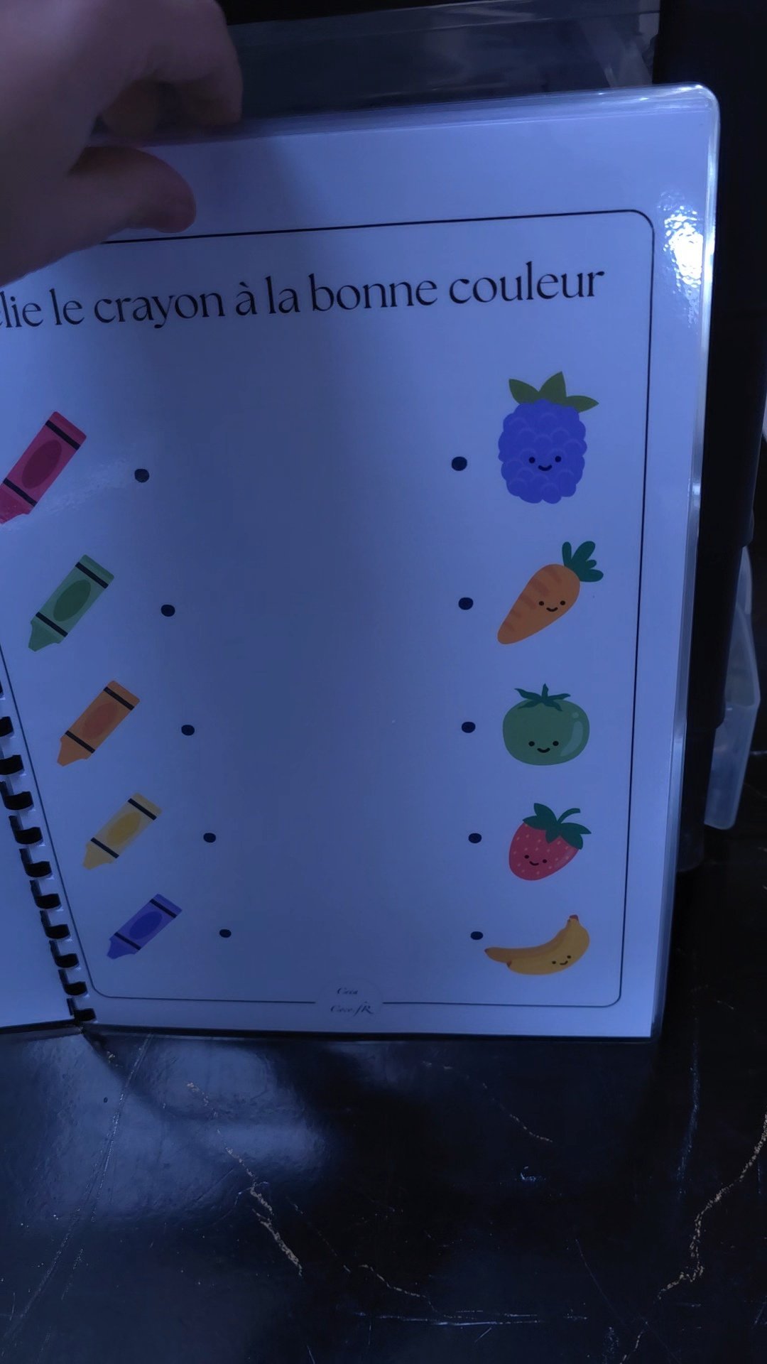 🎨 Logique & Couleurs : Un atelier « Relie le crayon à la bonne couleur » pour associer des objets du quotidien (carotte, fraise, banane…) à leur couleur correspondante.