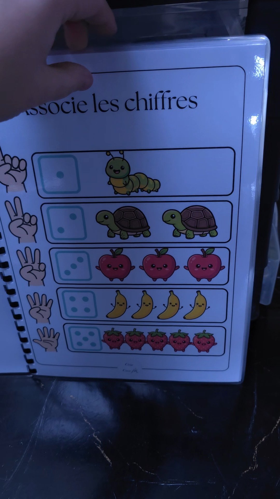 🔢 Numération : Un exercice pour associer les chiffres (de 1 à 5) aux constellations de dés, aux doigts de la main et aux quantités d’objets (tortues, pommes, bananes…).
