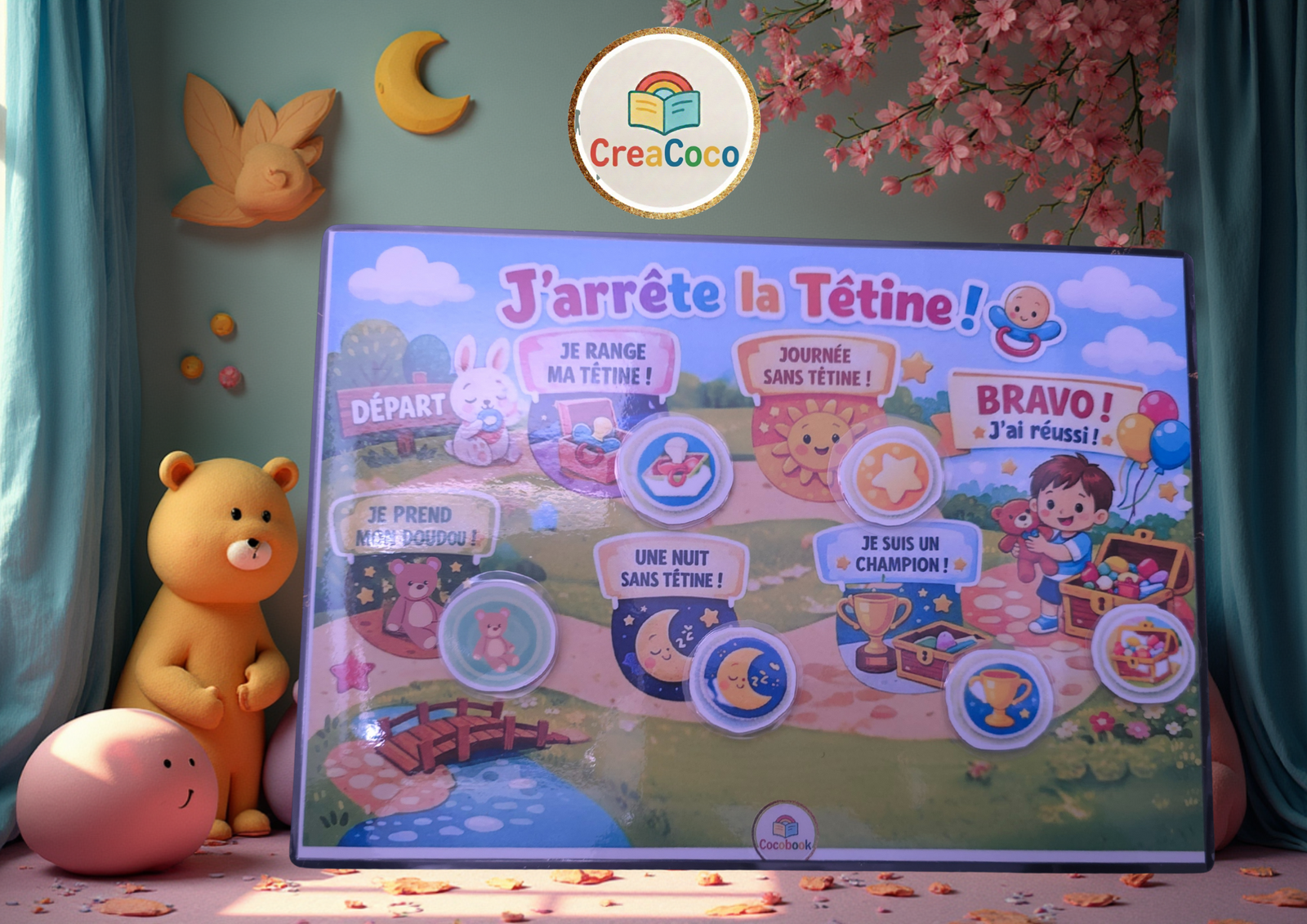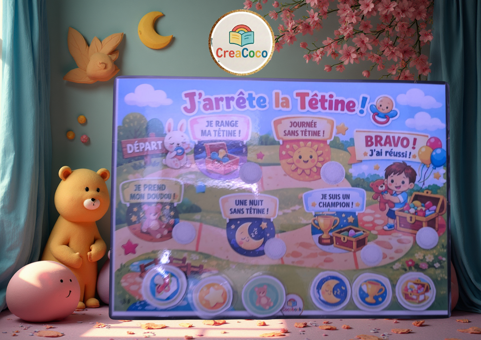 « L’arrêt de la tétine est une étape majeure dans la vie de votre enfant. Pour transformer ce défi en une aventure positive, CreaCoco a conçu ce tableau de motivation ludique. Grâce à un parcours visuel et des étapes gratifiantes (la nuit, la sieste, le rangement), votre enfant devient l’acteur de son propre succès. Un outil doux pour encourager l’autonomie sans stress ni larmes. »
